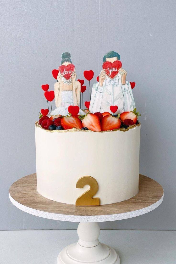 На торте изображены фигурки влюблённых и сердца, что является символом любви и верности.